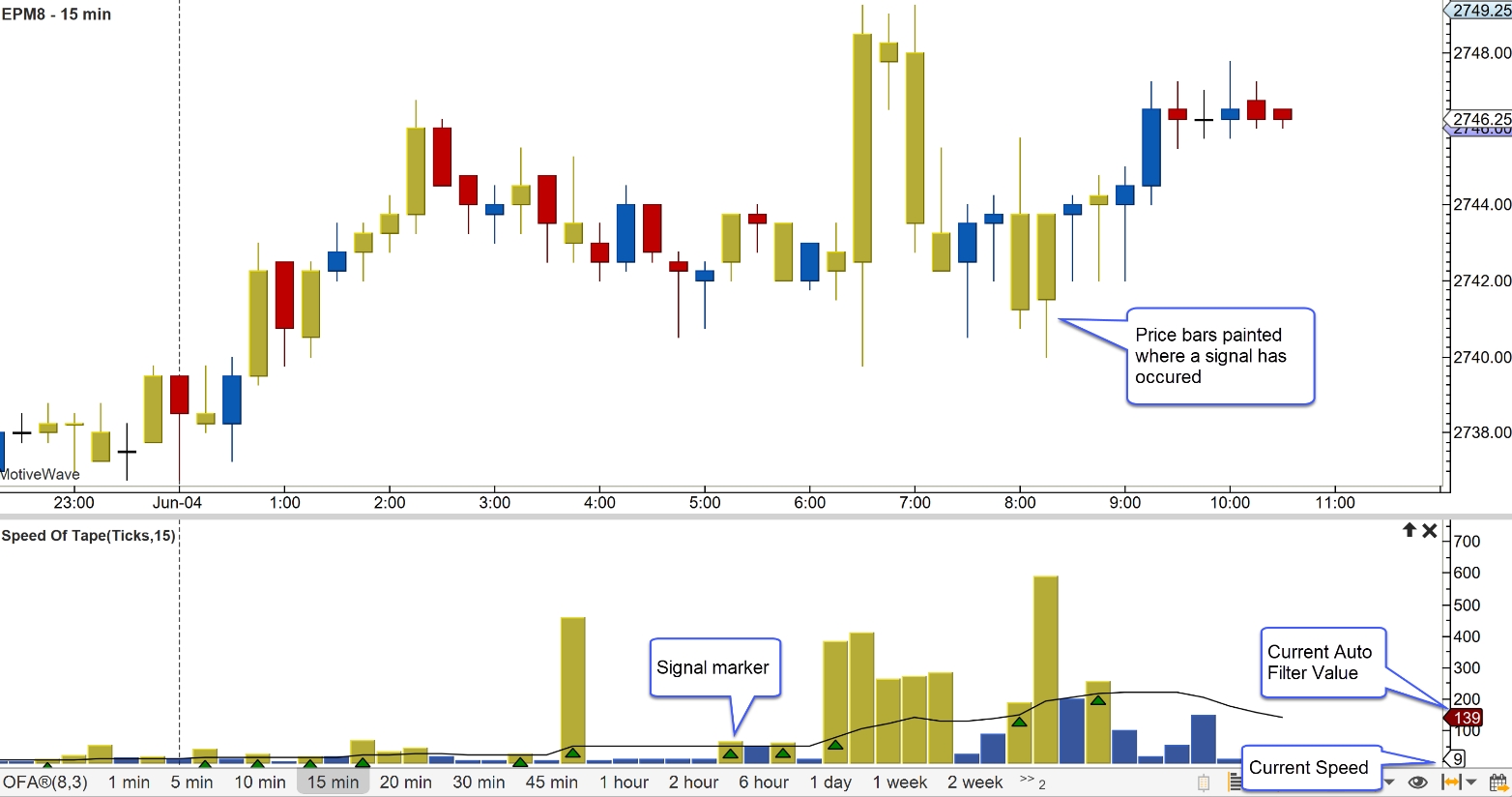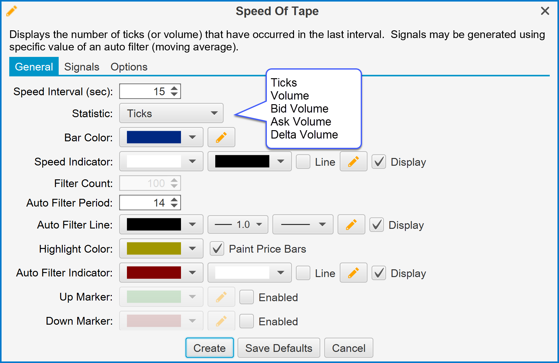 Speed Interval (sec) - The interval in seconds for computing the statistic. For example, number of ticks that occurred in the last 15 seconds. For historical values this will be the computed from the end time of the price bar.