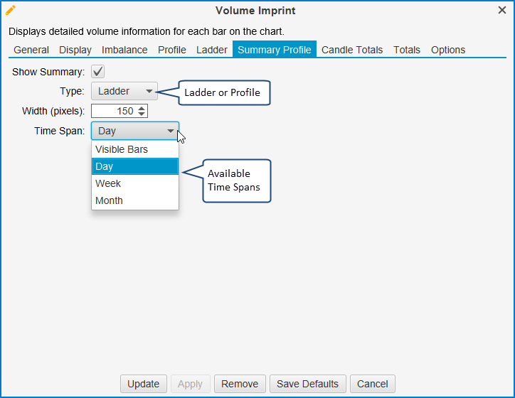Optionally, a summary profile can be displayed that summarizes the volume that occurred over the given time span (visible bars, day, week or month). This summary can be displayed as a volume profile or ladder.