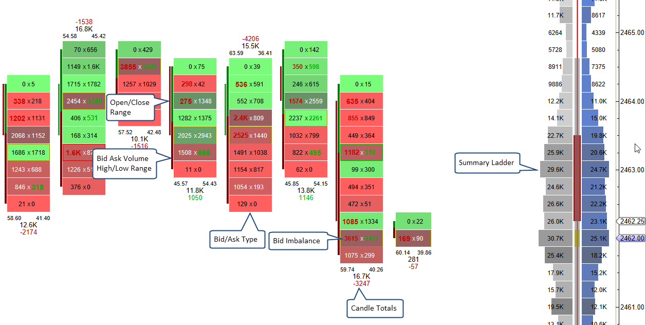 An optional summary profile can be displayed on the right-hand side of the chart. This summary tallies the bid/ask volume for the given time span and updates in real time. Two types of summary imprints are supported: Profile and Ladder.