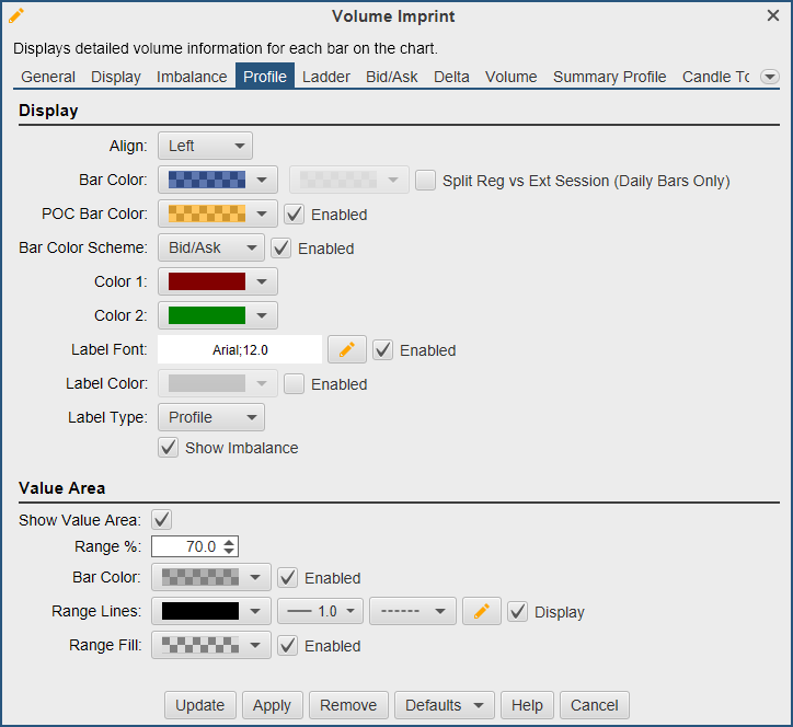 Display options for the Profile imprint type can be found under the Profile tab. The type of imprint is chosen from the General tab (see General tab). The profile imprint type displays a volume histogram for each bar on the chart. Each row in the histogram shows the volume that occurred at the given price interval (with optional coloring for the bid/ask volume).