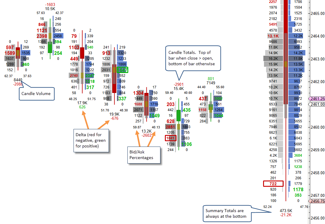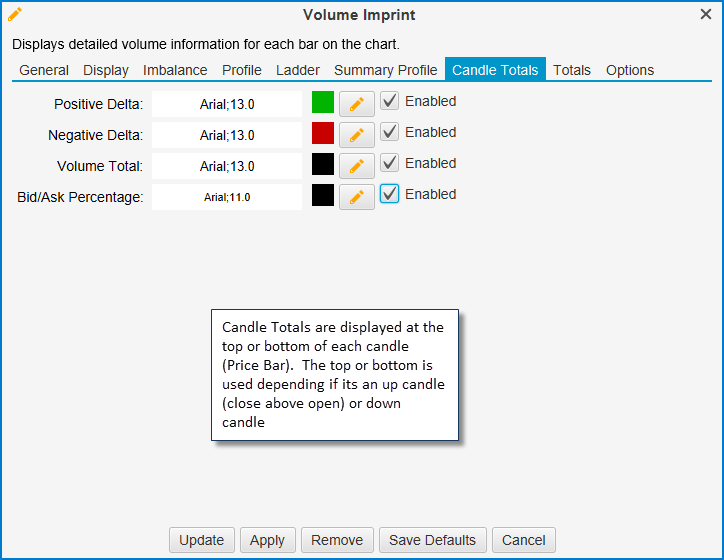 Candle totals can be displayed above/below each candle (price bar). The Candle Totals tab contains settings that you can adjust: