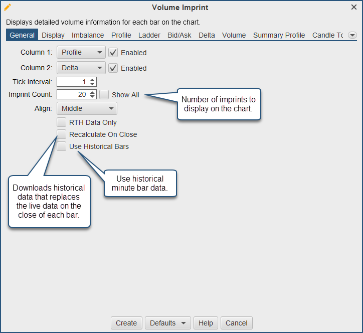 Imprint Count– This may be used to limit the number of imprints that are drawn on the chart. Loading historical tick data can be expensive in terms of computer resources and network activity. Check the “Show All” box to show all imprints in the time range of the chart.