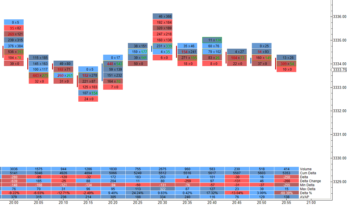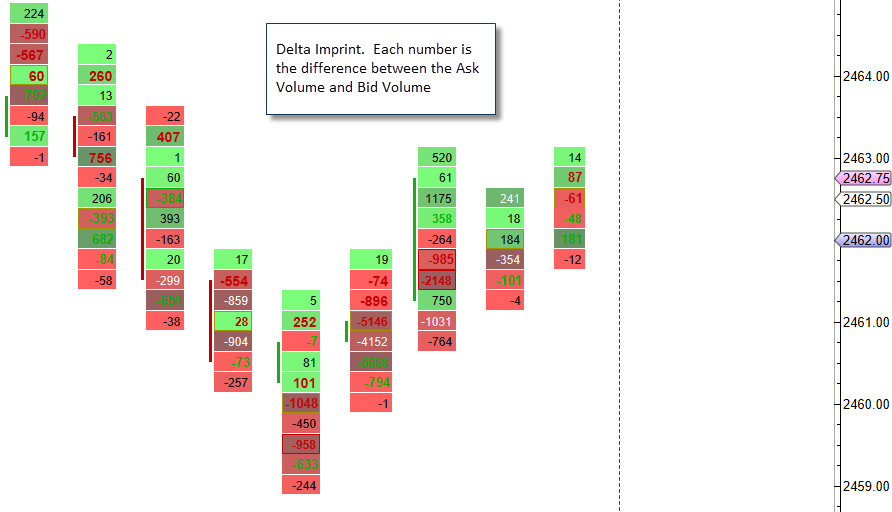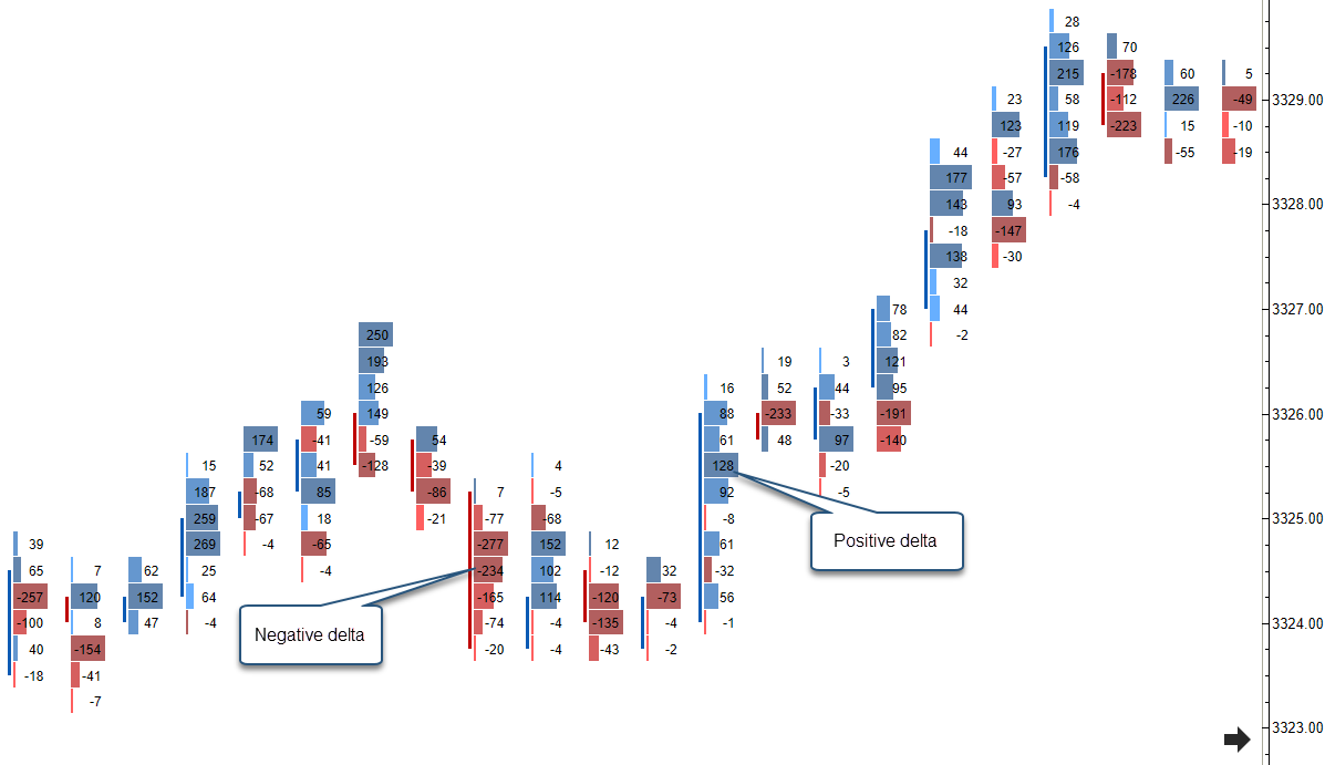 Delta – Numerically displays the difference between the ask volume and bid volume (delta) at each price interval.