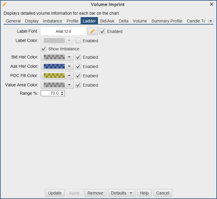 The Ladder tab contains settings that apply to the imprint type of ‘Ladder’ (see General Settings). The ladder view displays bid and ask volume (using a histogram) on opposite sides of a price bar. Note: The Open/Close and Bid/Ask Volume ranges do not apply to this imprint type (see Display Settings).