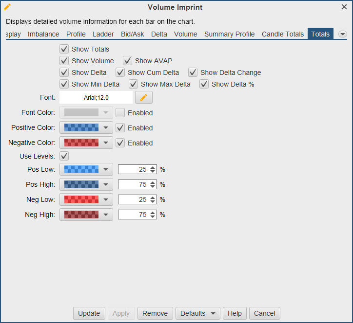 Display options for the Delta imprint type can be found under the Delta tab. The type of imprint is chosen from the General tab (see General tab). The delta imprint type displays the delta volume between the bid volume and ask volume at each price level.