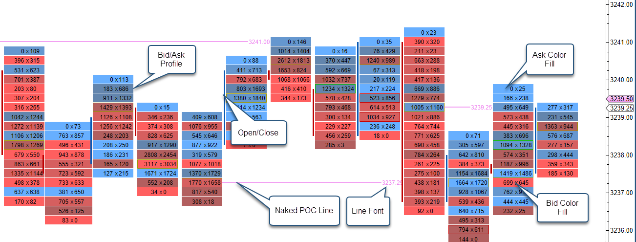 POC Bar Color – Color for the Point of Control (POC) bar. Tip: use a semi-transparent color so you can still see the bid/ask volume for the bar.
