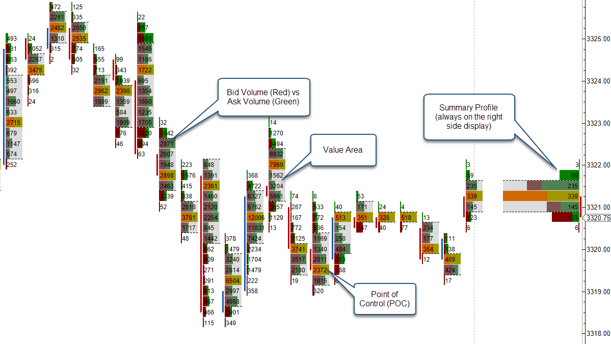 Profile – Displays a histogram of the volume that occurred at each price interval. The volume can be color coded to show bid/ask volume.