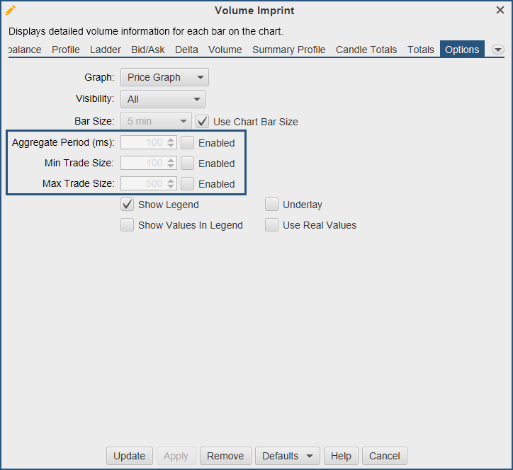 The settings changed in Options will effect all imprint types. The aggregate and trade size settings can be used to display imprints showing only specific trade sizes. This can be used to filter out small or large trades.