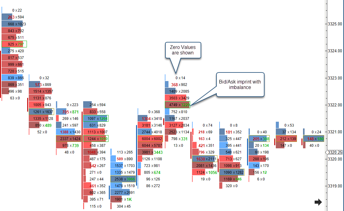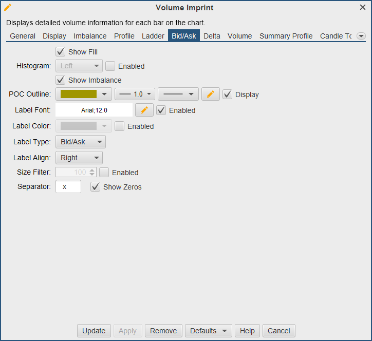 Display options for the Bid/Ask imprint type can be found under the Bid/Ask tab. The type of imprint is chosen from the General tab (see General tab). The bid/ask imprint type displays volume totals for trades at the bid and ask for each bar on the chart. Each row shows the volume that occurred at the bid/ask for the given price interval.