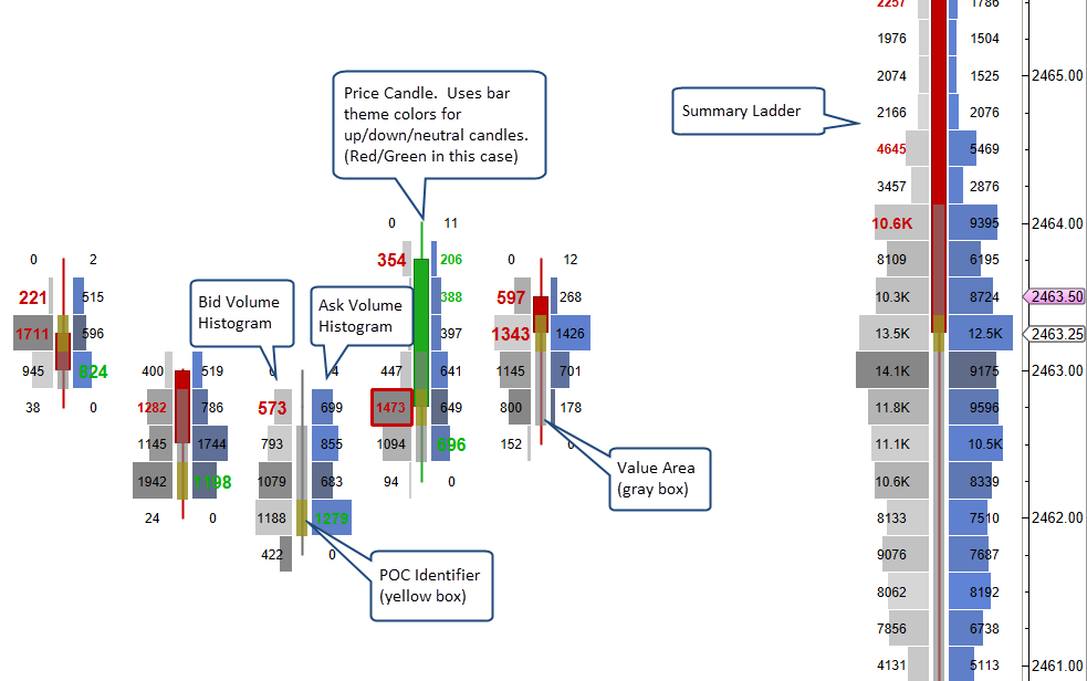 Ladder – Displays separate histograms for bid and ask volume on opposite sides of a price bar.