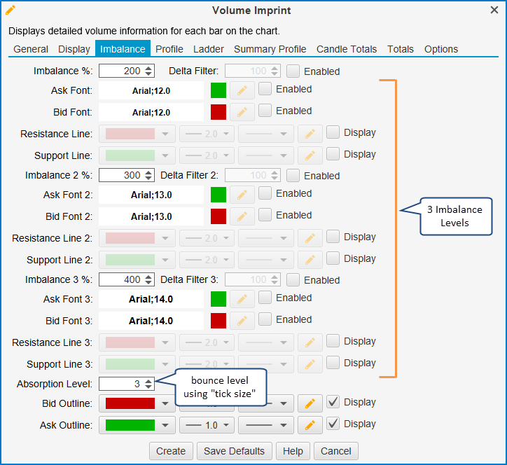 The Imbalance tab (see below) contains settings for displaying Buy/Sell imbalances and absorption. Currently up to 3 levels of imbalances are supported. Imbalances are visualized on the chart by using a different font and color. Optionally, support and resistance lines may be extended where the imbalances occur.