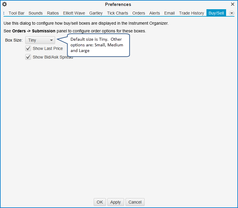 You can modify the preferences for the Buy/Sell boxes from the Preferences dialog (Configure -> Preferences from the Console menu bar).