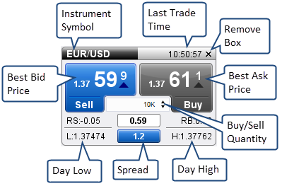 A Buy/Sell box shows the current Best Bid and Best Ask prices for an instrument and makes it easy to quickly place a market order to buy or sell the instrument. The following diagram shows the elements of a Buy/Sell box: