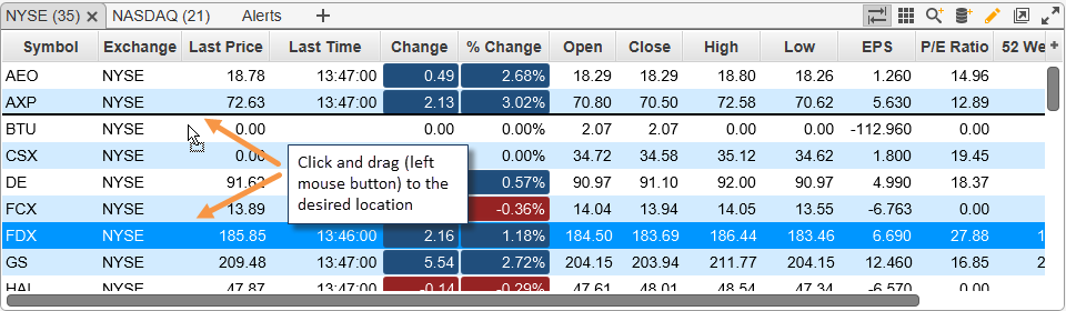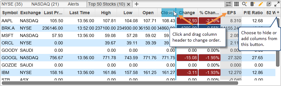 For convenience, columns can be modified directly from the Watch List. Click and drag a column header to change the order. On the right hand side of the column header, there is a button that can be used to show or hide columns.