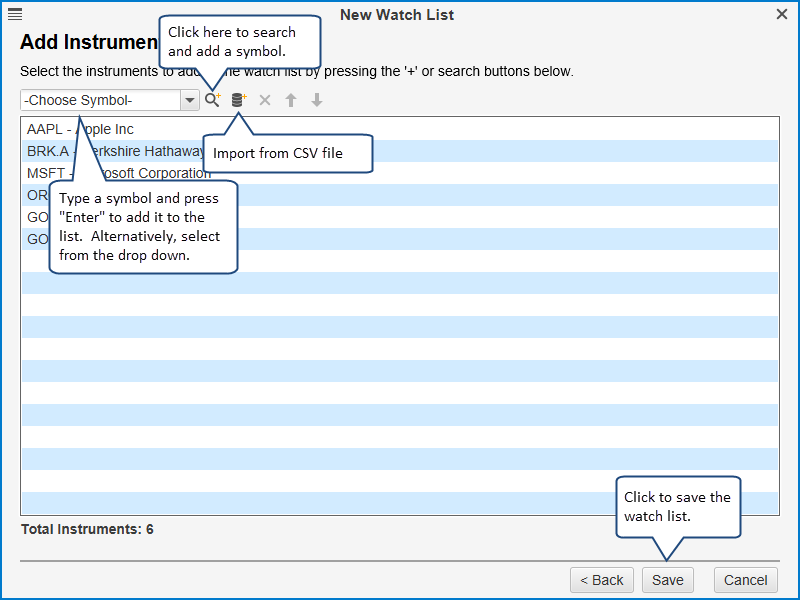 The last step is to choose the set of instruments that will be displayed in the Watch List. Type the name of the symbol in the -Choose Symbol- field and press Enter to add it to the list. Alternatively, select a name from the drop down. You can also search for a particular symbol by clicking the Search/Add button. If supported by your broker/data service you can import a set of symbols by clicking on the import button (see below).