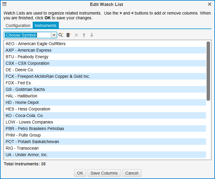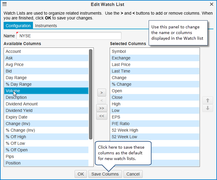 Click on the Edit Watch List button (pencil icon) on the Watch List tool bar to open the Edit Watch List dialog. From this dialog you can change the name, available columns or the instruments.