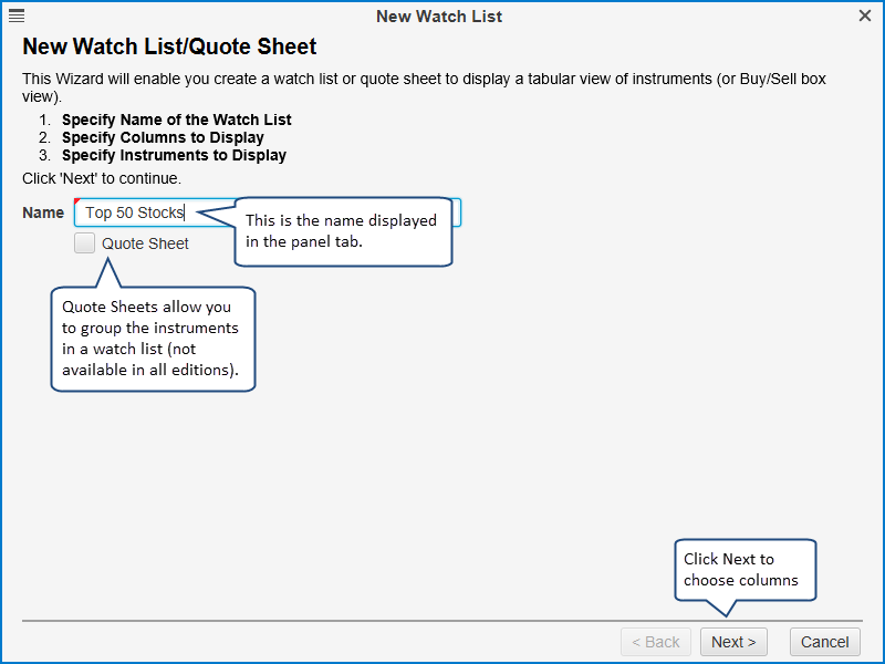 On the first page of the New Watch List wizard, you will be asked for the name of the Watch List. This name will be displayed on the panel tab.